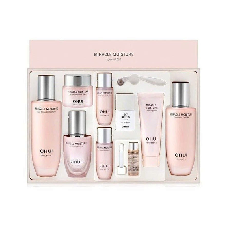 1. Nước Hoa Hồng Ohui Miracle Moisture Pink Barrier Skin 150ml + 20ml: Lớp dưỡng ẩm đầu tiên, giúp làm mềm da, tăng cường khả năng hấp thụ các dưỡng chất trong các bước tiếp theo