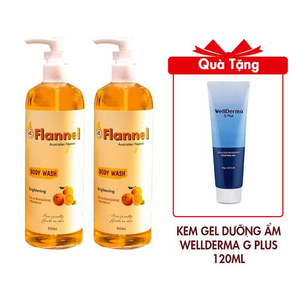 Combo 2 Sữa Tắm Làm Sáng Da Flannel Hương Cam & Quýt 500mlx2 Tặng Gel Dưỡng Ẩm Cấp Nước Trẻ Hóa Da Wellderma G Plus Mils Acis Ance Gel Cleanser 120ml