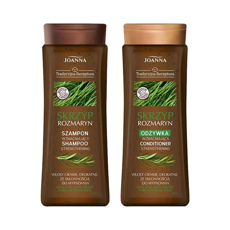 Bộ dầu gội và dầu xả Joanna Tradycyjna Receptura Skrzyp Rozmaryn đến từ Ba Lan, chiết xuất từ cỏ đuôi ngựa (Horsetail) và hương thảo (Rosemary), giúp nuôi dưỡng tóc chắc khỏe từ gốc đến ngọn.