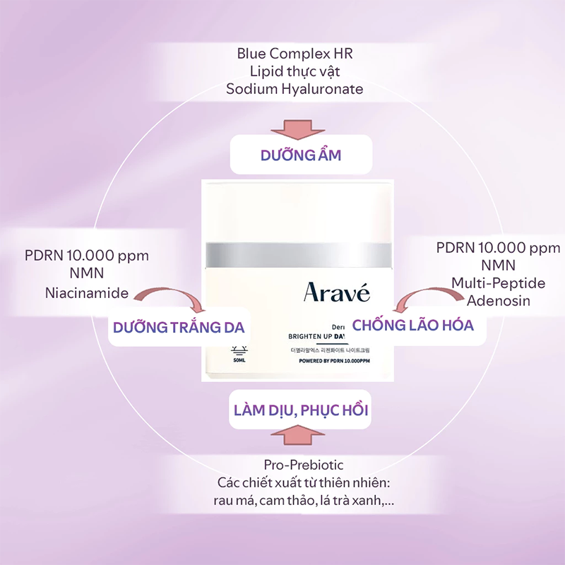 Combo Kem Dưỡng Da Ban Ngày Và Ban Đêm ARAVÉ Dưỡng Trắng, Mờ Nám, Ngừa Lão Hóa Dermela.RX 50mlx2