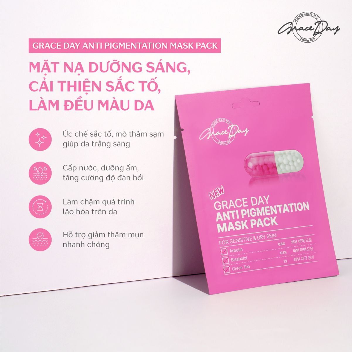 Grace Day Anti-Pigmentation Mask Pack mang đến công thức dưỡng sáng mạnh mẽ, làm đều màu da, ức chế sắc tố melanin phát triển, làm giảm các vấn đề về sắc tố da, chống lão hóa vượt trội