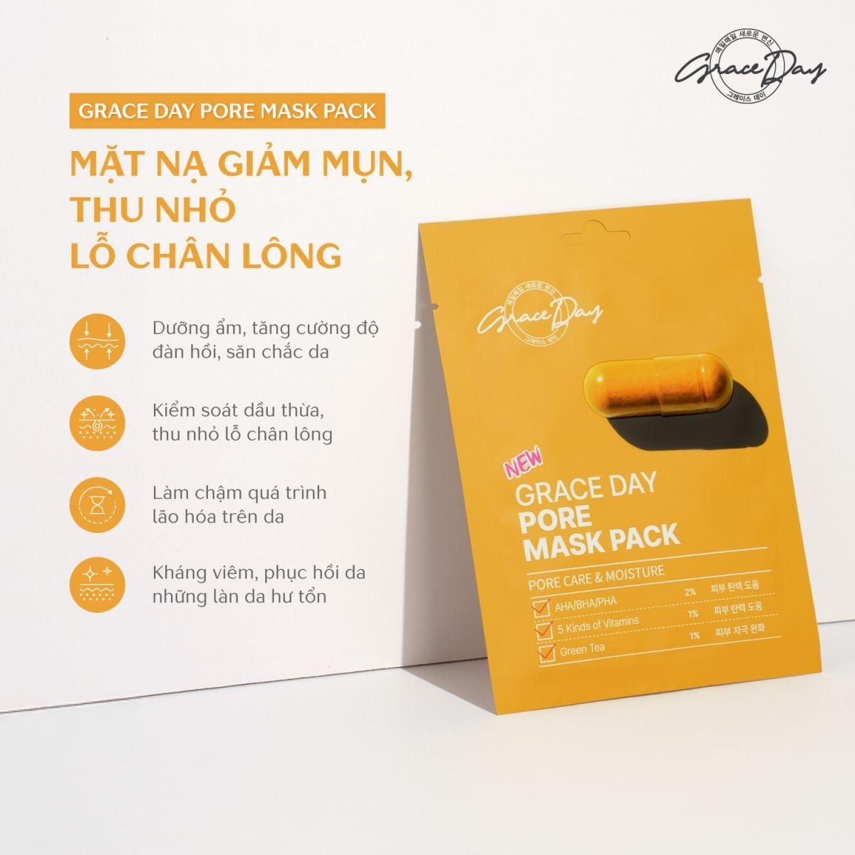 Grace Day Pore Mask Pack mang đến công thức mạnh mẽ giúp giảm mụn và kháng viêm hiệu quả cao, kiểm soát dầu thừa, thu nhỏ lỗ chân lông, từ đó, giảm thiểu các vấn đề về mụn và thông thoáng da.