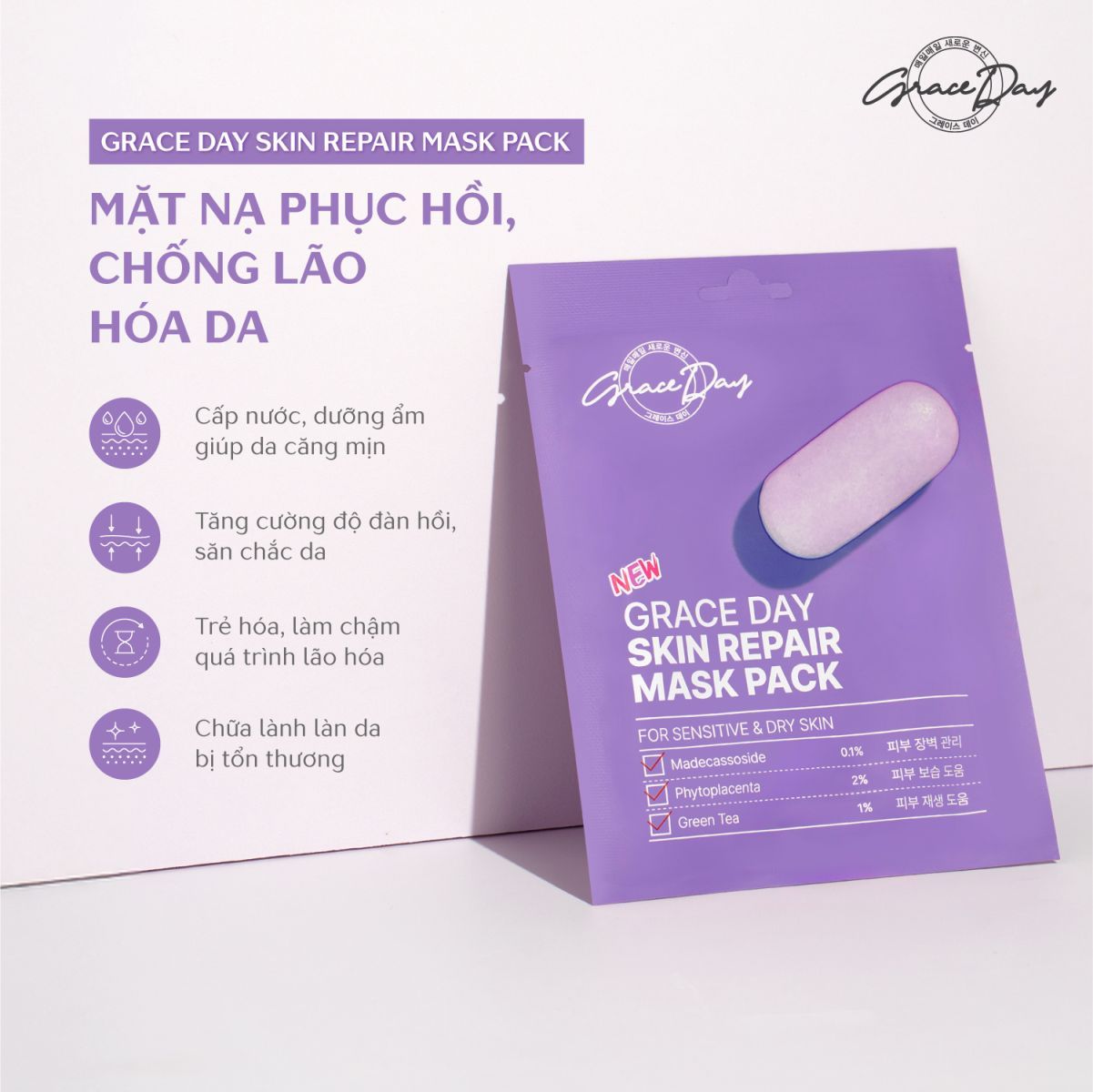 Grace Day Skin Repair Mask Pack mang đến công thức chống lão hoá mạnh mẽ từ thành phần thiên nhiên. Giúp phục hồi, làm dịu tổn thương trên da, cải thiện kết cấu bề mặt da với công dụng vượt trội.