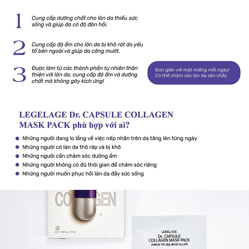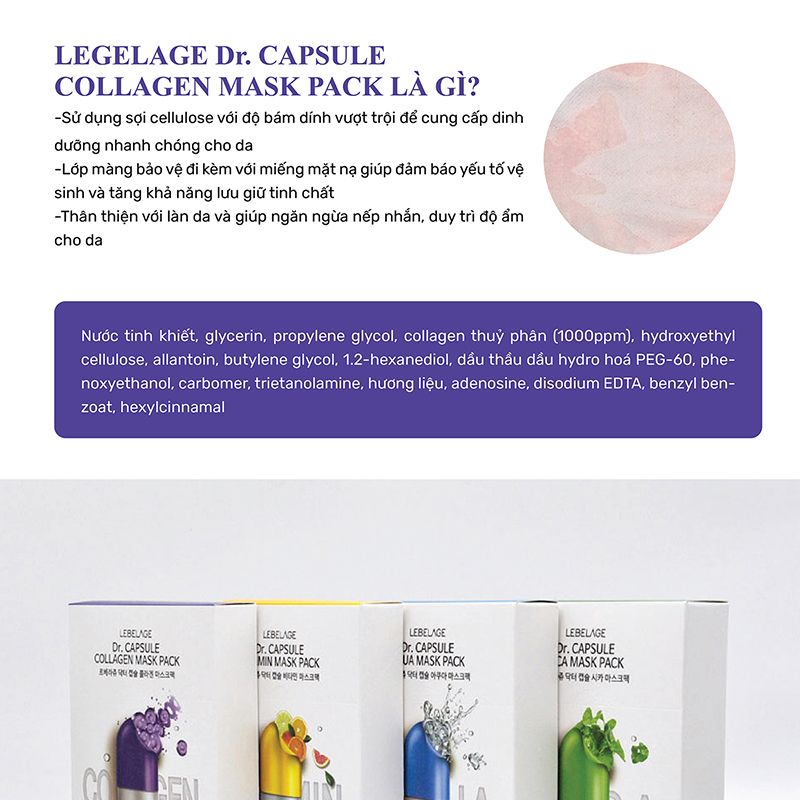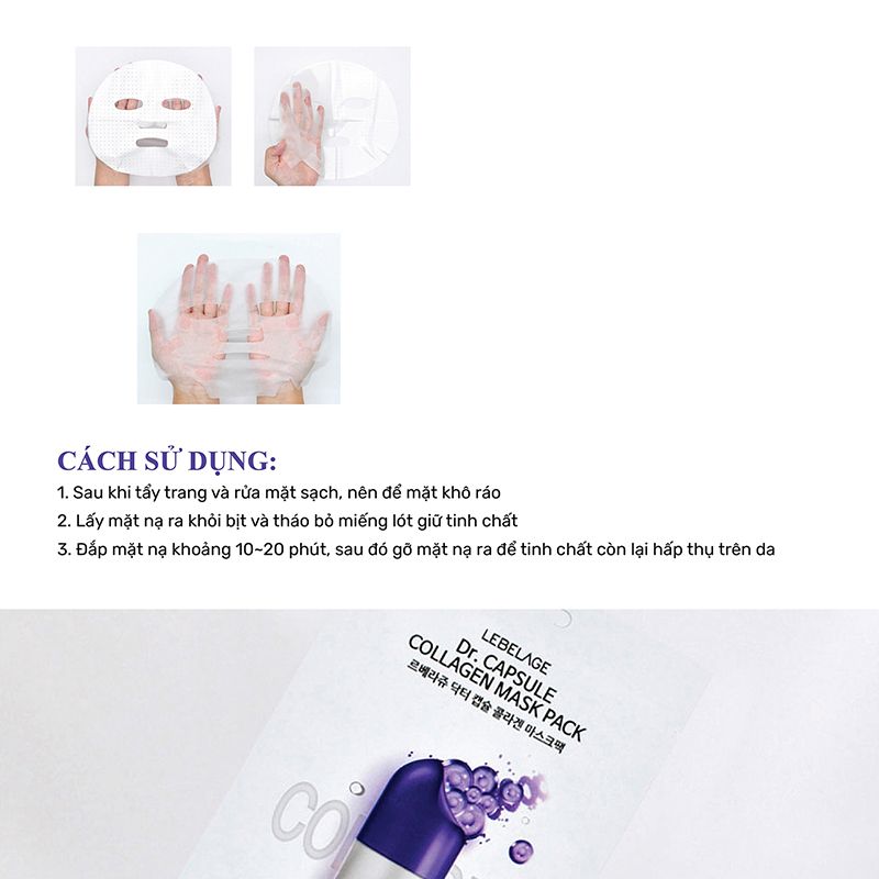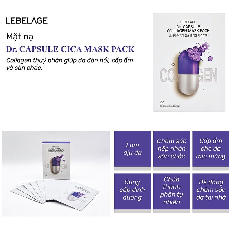 Mặt Nạ Lebelage Dr.Capsule Collagen Mask Pack Tăng Độ Đàn Hồi, Ngừa Lão Hóa cung cấp và bổ sung collagen cho làn da, giúp da có độ đàn hồi, săn chắc hơn và cải thiện nếp nhăn da.