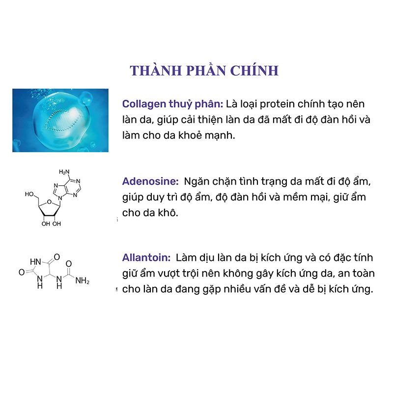 Adenosine: Ngăn chặn tình trạng da mất đi độ ẩm, giúp duy trì độ ẩm, độ đàn hồi và mềm mại, giữ ẩm cho da khô.