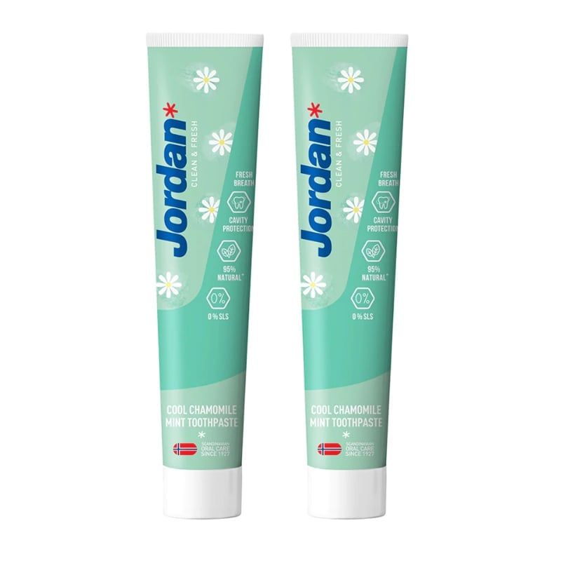 Kem đánh răng dành cho người lớn của Jordan Clean and Fresh được sản xuất theo công thức đặc biệt để bảo vệ răng chống lại bệnh sâu răng. Sản phẩm có thành phần thiên nhiên đến 95%. Sản phẩm chứa hàm lượng Flouride khuyến nghị và chất tạo bọt nhẹ và có hương vị bạc hà the mát và hoa cúc mát lạnh.