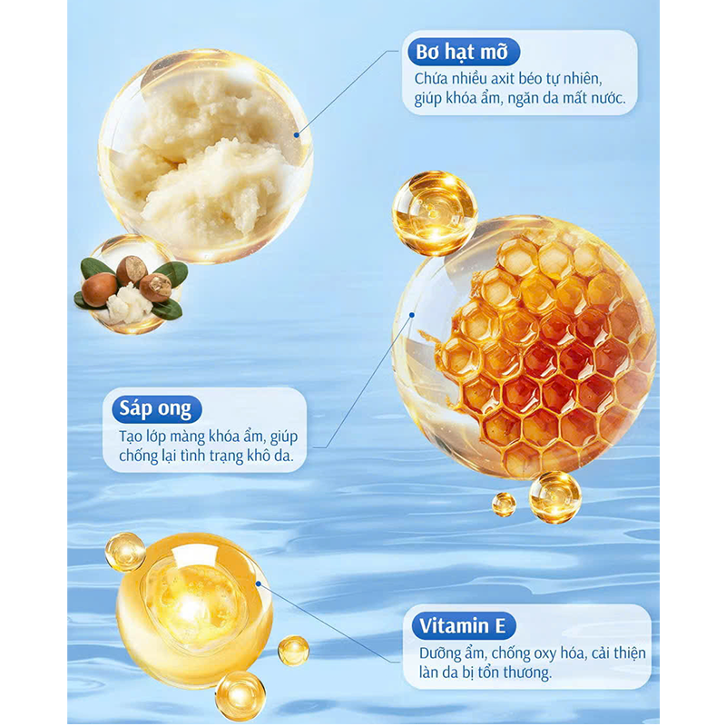 - Bơ hạt mỡ & sáp ong chứa Lipid tự nhiên củng cố hàng rào ẩm cho da