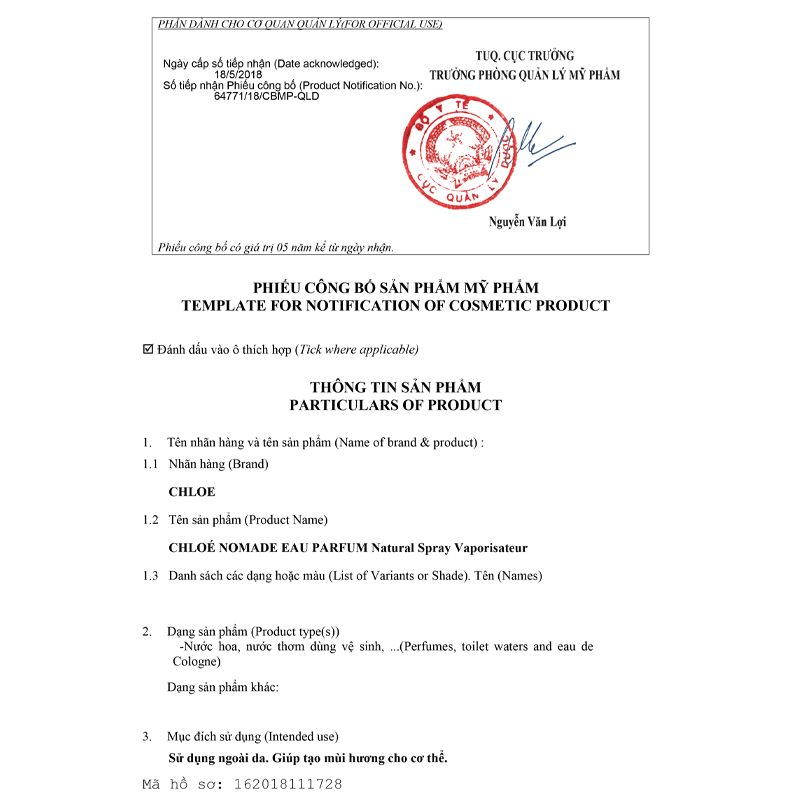Nước hoa nữ Chloé Nomade thuộc nhóm hương hoa chypre. Với sự pha lẫn mùi hương từ mận Mirabelle, freesia và rêu sồi. Tạo ra mùi hương đặc biệt, có phong cách dịu nhẹ nhưng không kém phần quyến rũ và gợi cảm.