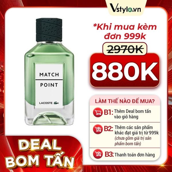 Lacoste Match Point EDT một sự kết hợp bùng nổ của hai sự tương phản. Năng lượng xanh của húng quế và vị đắng của cây khổ sâm kết hợp tạo nên một sự tươi mát ngoạn mục. Xanh tươi nhưng không hề mờ nhạt, Xô thơm như một nét màu hoang dại, điểm phát thêm chút thanh cay, ngọt dịu của Xô thơm và Hoa phong lữ. Màu đen sang trọng của cỏ vetiver thân gỗ mang đến sức mạnh và sự mãnh liệt.