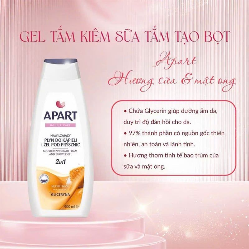 Gel tắm Apart dưỡng ẩm, mềm mịn da chiết xuất Hương Sữa và Mật Ong 900ml với thành phần thiên nhiên giúp làm sạch bụi bẩn, loại bỏ vi khuẩn và dầu thừa trên da đồng thời dưỡng da mịn màng mềm mượt. Sản phẩm có hương thơm dễ chịu và giúp bạn thư giãn nhẹ nhàng sau một ngày dài.