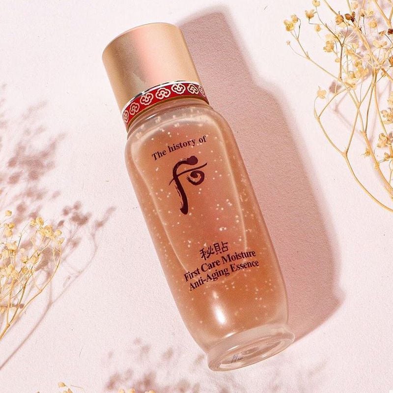 First Care Moisture Anti Aging Essence là tinh chất chứa đựng tinh túy Đông y Hoàng cung: Giải Uất Hoàn và Cống thần bí đơn cung cấp dưỡng chất, giúp cân bằng độ ẩm và trẻ hóa cho da.